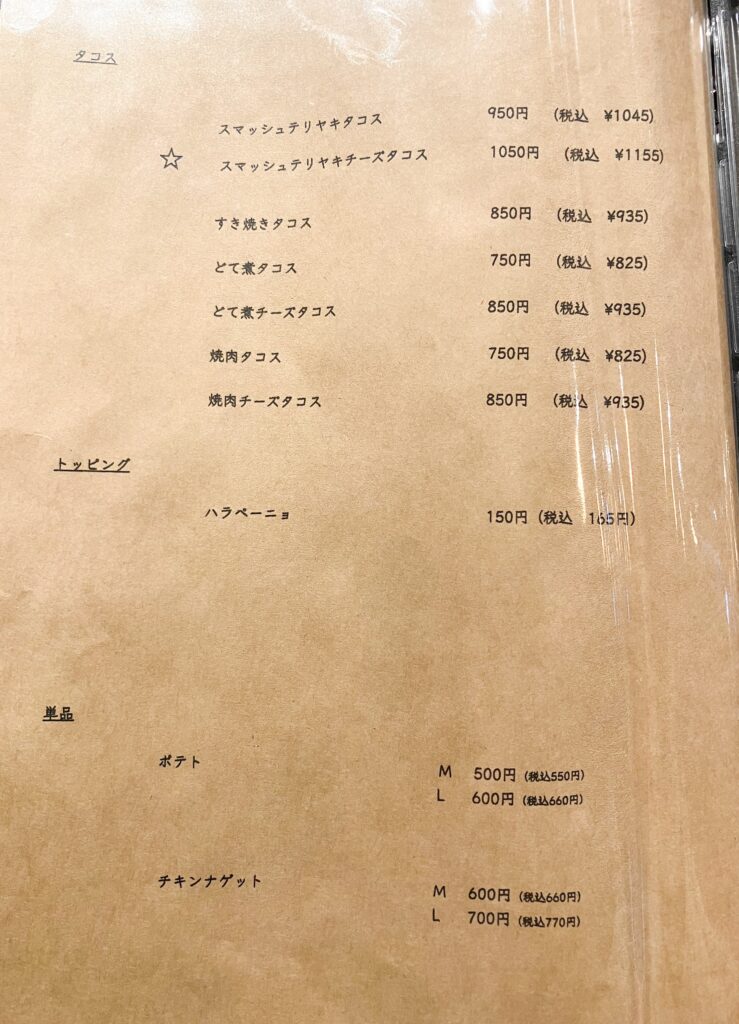 メニューを開くとテリヤキタコスやすき焼きタコスなど、和の要素を取り入れた魅力的なラインナップがずらりと並びます。