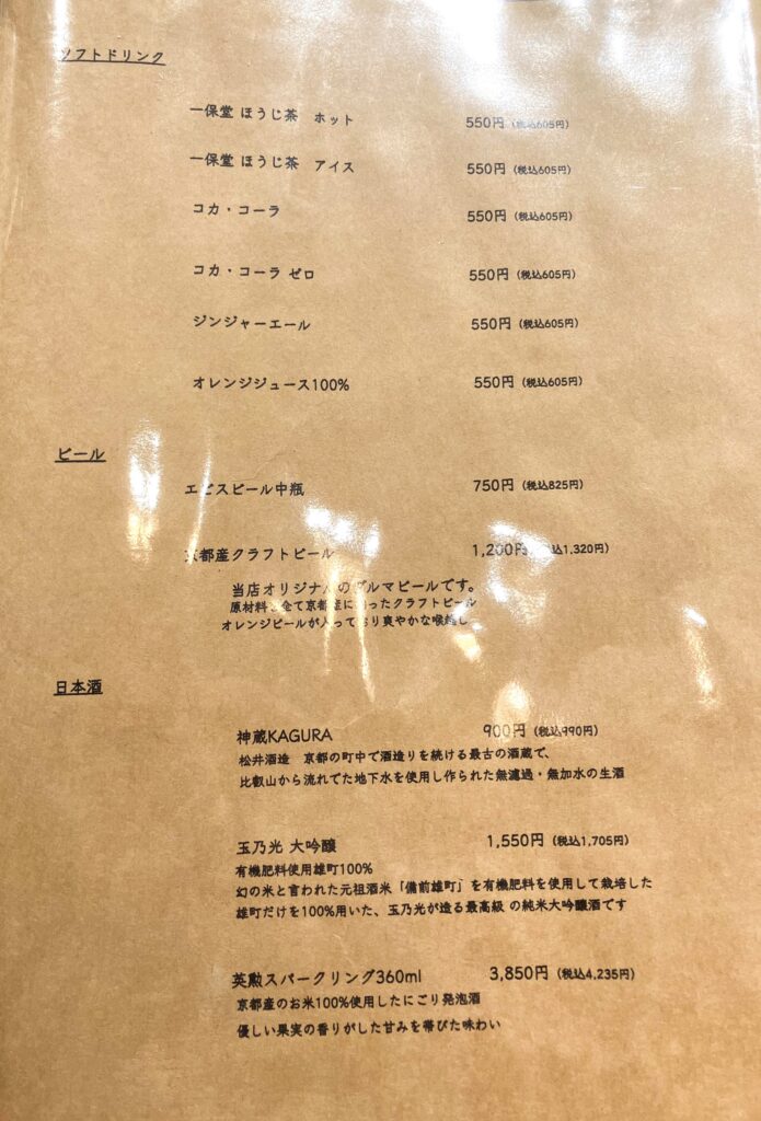 ドリンクメニューは定番のコーラやオレンジジュースはもちろん、一保堂のほうじ茶が用意されているのも京都らしさを感じます。