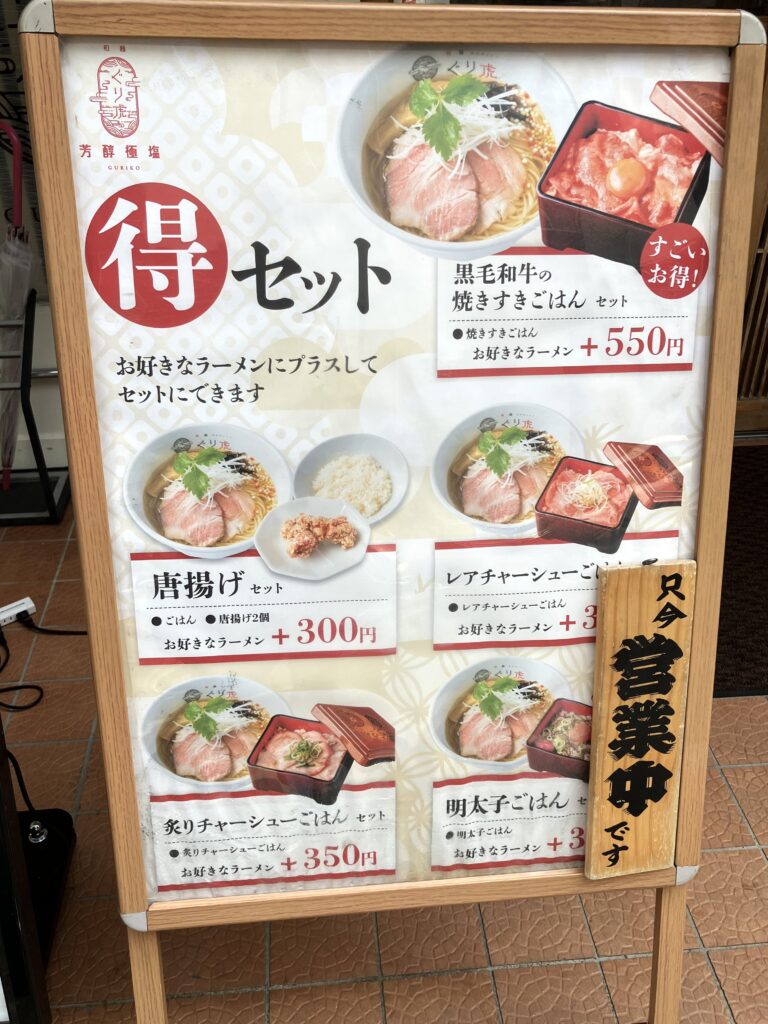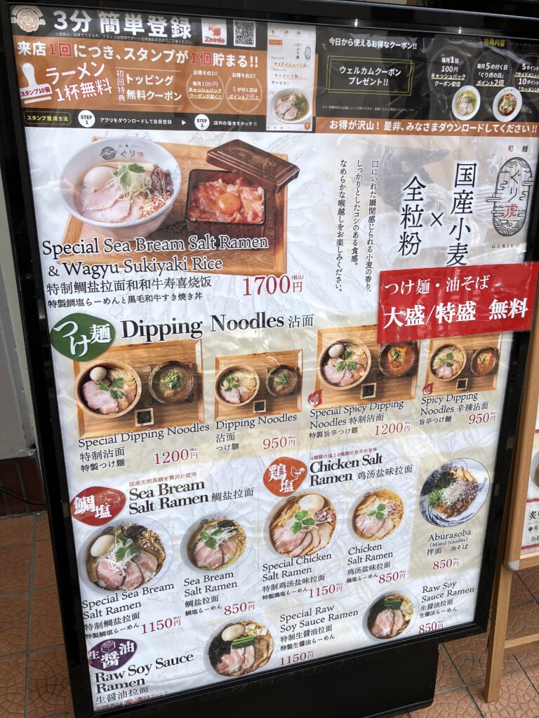 「和麺ぐり虎 京都本店」では、鯛塩ラーメンや鶏塩ラーメンをはじめ、生醤油ラーメン、つけ麺など多彩なメニューがずらり。さらに専用アプリを登録すると、海苔・味玉・チャーシューのいずれかを無料で追加できる初回特典があるのも嬉しいポイントです。