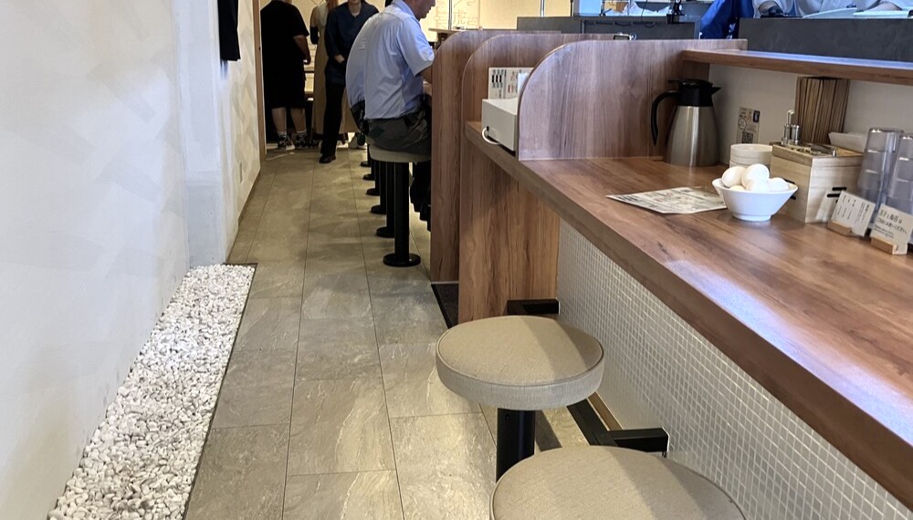 店内はカウンター10席ほどと奥に4人掛けのテーブル席を備え、白と木目を基調としたカジュアルモダンな雰囲気。11時過ぎの訪問時にはすでにカウンター席がほとんど埋まっており、人気店である様子が伝わってきました。