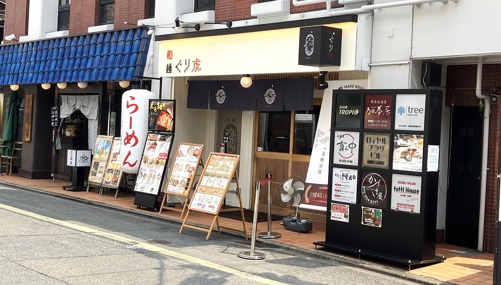 京都市中京区・東洞院六角を歩くと目に入るのが「和麺ぐり虎 京都本店」です。白を基調とした外観に大きな提灯が掲げられ、店頭には豊富なメニュー看板が並んでいます。