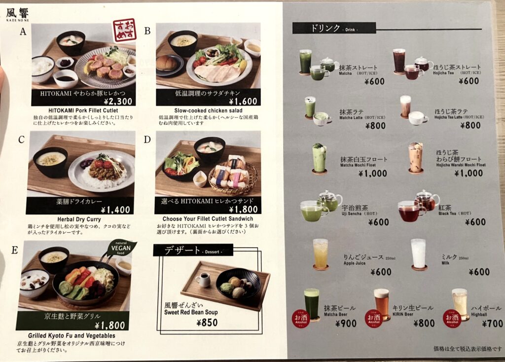 食事に合わせて日本茶や抹茶ドリンクも用意されており、昼食から軽めの食事まで幅広く対応しています。