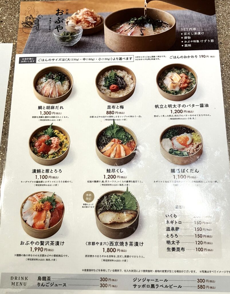 だし茶漬けのメニューは全部で10種類|京都おぶや 四条烏丸店
