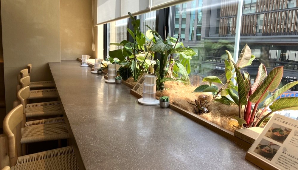 店内は2人掛けのテーブルが10席、カウンター席が8席ほどあり、13時頃にはテーブル席の半分以上が埋まっていました。一人でも立ち寄りやすい雰囲気があり、大きな窓からは四条通を見下ろすことができます。祇園祭の時期には、月鉾や鶏鉾などを眺めながら食事を楽しめるでしょう。
