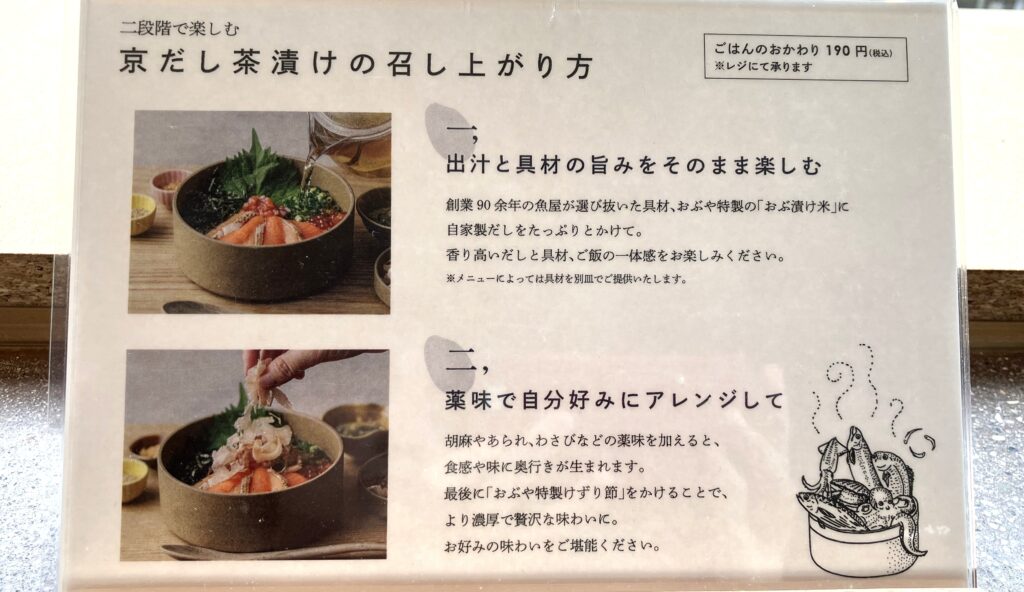 軽やかなのに満足感のあるお茶漬けは、暑い日や食欲がないときにもおすすめ。四条烏丸に立ち寄った際は、ぜひ京都の新しい食の楽しみ方を体験してみてください。