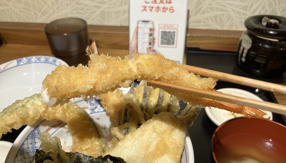 海老天は衣が軽く、箸を入れるとさくっと心地よい食感です。