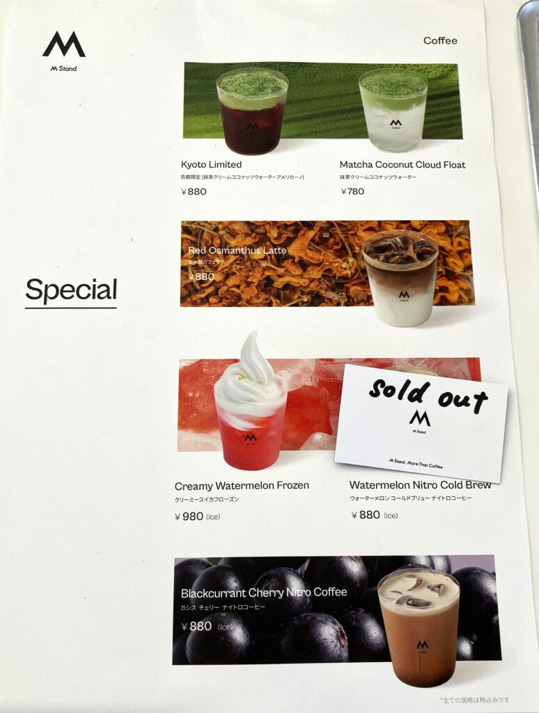 スペシャルメニューには、抹茶やスイカ、カシスを使った個性豊かなドリンクが並びます。なかでも「Kyoto Limited」は、抹茶クリームとココナッツウォーターを合わせた一杯で、京都ならではの味わいが楽しめます。