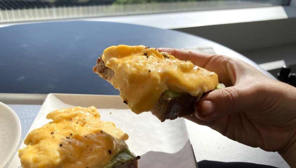 一緒に注文した「アボカドスクランブルエッグトースト」は、くるみパンを使用!香ばしい生地にとろける卵とまろやかなアボカドペーストがよく合います。