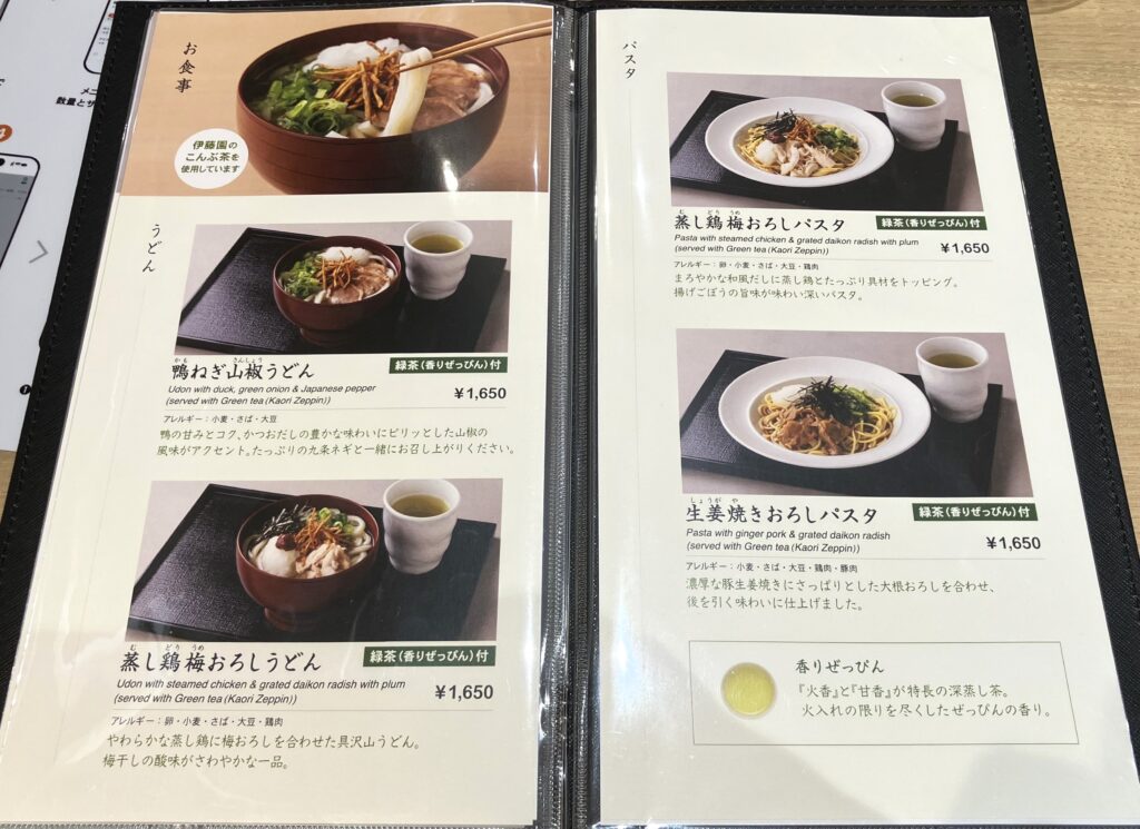 注目のランチメニューは「鴨ねぎ山椒うどん」や「蒸し鶏梅おろしパスタ」など、お茶との相性がよい和のメニューが勢ぞろい。