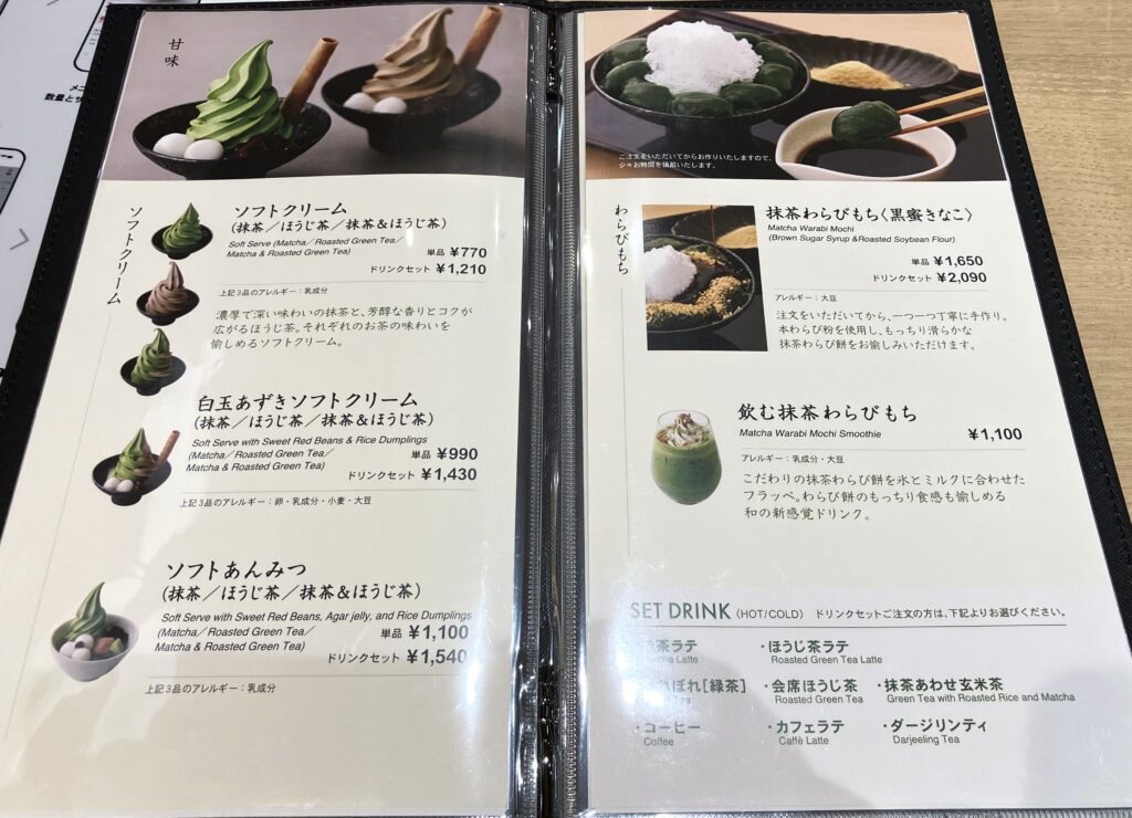 甘味メニューは、定番の抹茶ソフトクリームやあんみつに加え、飲む抹茶わらびもちといった新感覚のデザートなど、遊び心あふれるラインナップ。