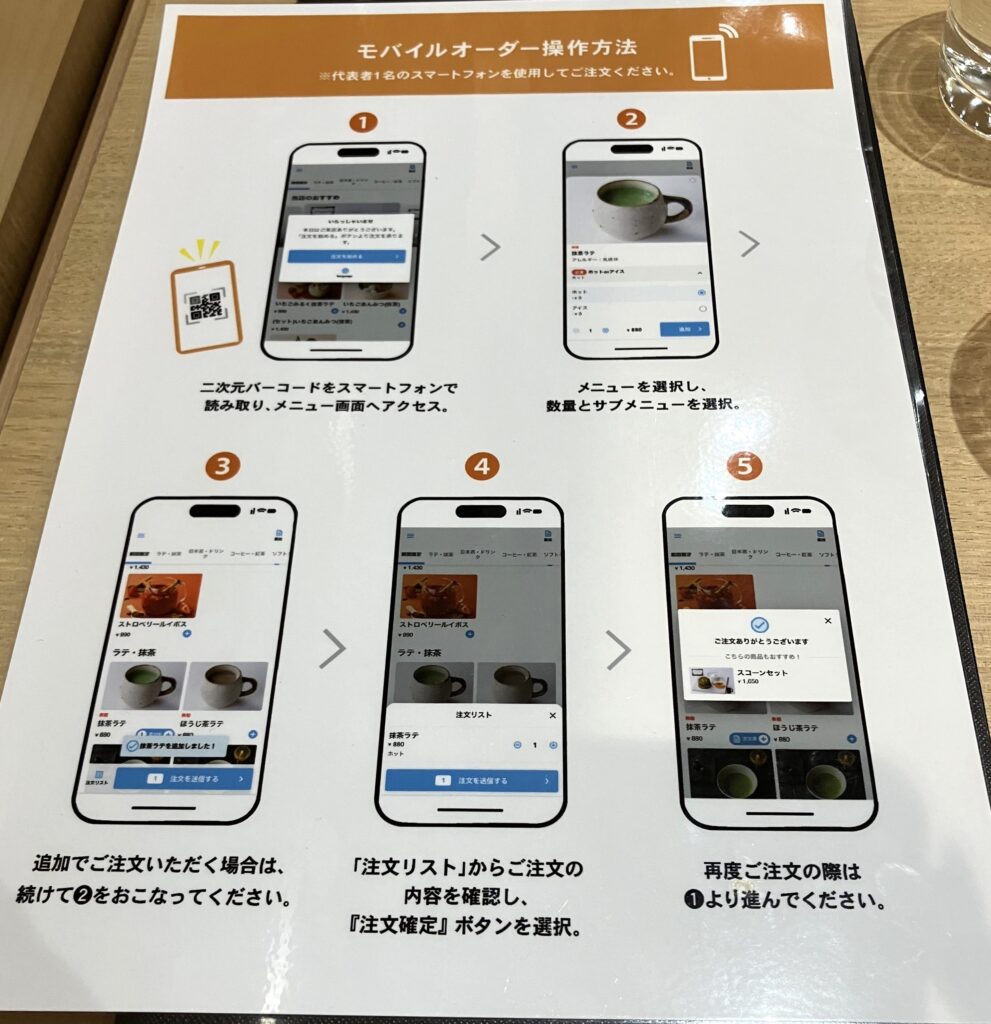 注文は、スマートフォンを使用したモバイルオーダー制です。卓上には分かりやすい操作ガイドも用意されているため、初めての方でも迷わず注文できます。